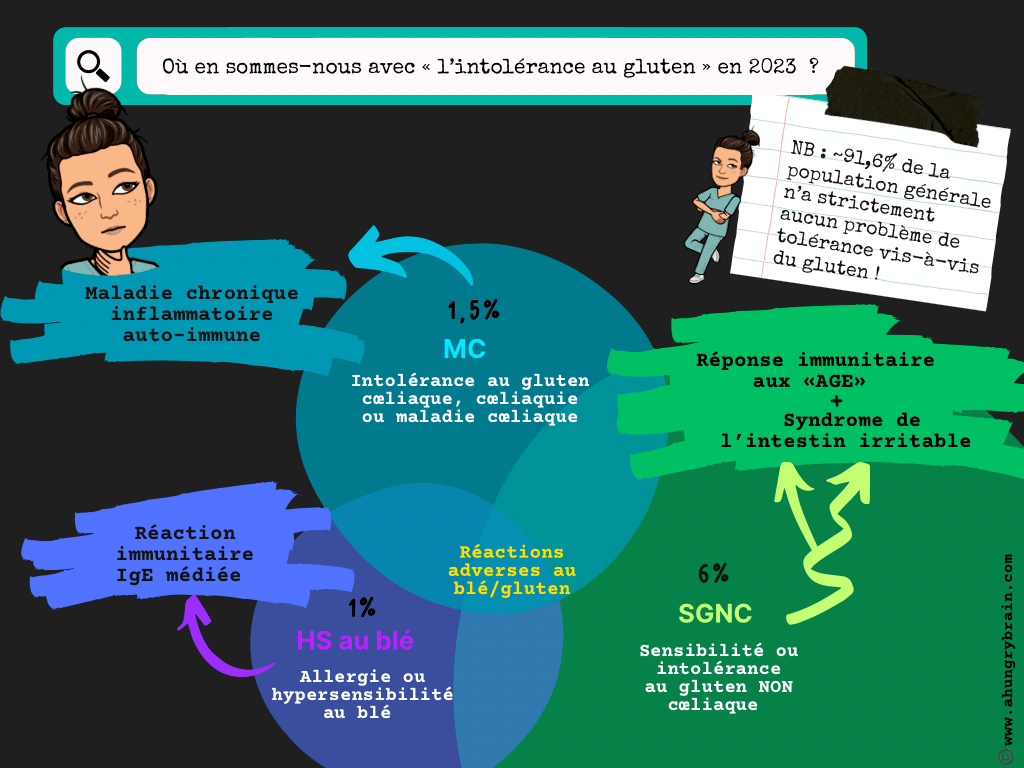 - L’intolérance au gluten NON CŒLIAQUE (qui recoupe en réalité deux autres pathologies distinctes de la coeliaquie : le Syndrome de l’Intestin Irritable ou SII, et une toute nouvelle entité diagnostic datant de 2022, que sont les réactions immunitaires aux « AGE », acronyme pour « Advenced Glycation End Products », mais ça je t’en parle dans cet article)